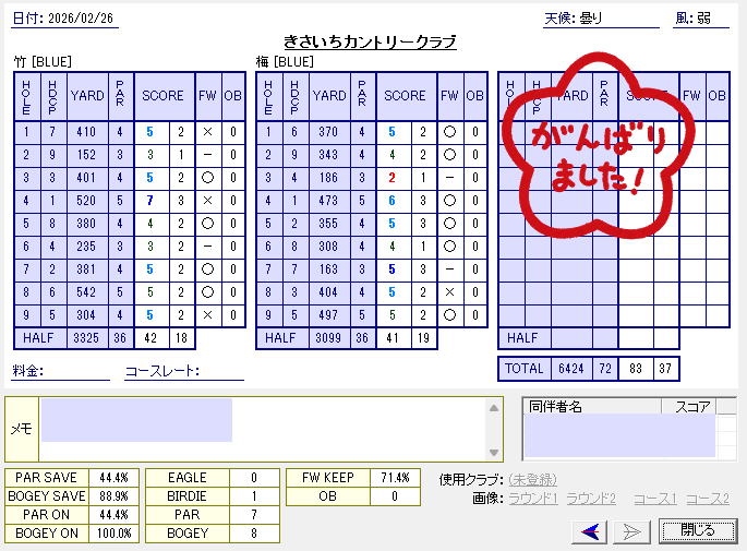 2月は史上最小の2回しか更新できなかった。今月は3回ぐらい更新できればいいな。確定申告の進捗次第だけど。 というわけで、真面目に更新。先週木曜日、26日のMの会。この日も「基本に忠実に」「振り切る!」がテーマ。 ![]() そのせいかパーオン率は44.4%(8ホール)と私にしてはまずまず。OBも無かった。基本&振り切る最強説。 ダメだったのはパット。短いの(80cm以内)を3つ外し、3パット4つ。短いのは緩んで右へ外すダメダメなやつ。 よくあるよね、なぜかパットを強く打てなくて全部弱くなる日が(え、ない?)。私は5ラウンドに1回ぐらいある。あとやたらオーバーする日とか(4ラウンドに1回)、距離感が合わない日(3ラウンドに1回)とか、一筋外れる日とか(2ラウンドに1回)、全然入らない日とか(毎ラウンド)。でも入りまくる日もあるからね(50ラウンドに1回)。 ダボは2つ。竹4番はティショットを引っ掛けてバンカーへ、バンカーからPWで出すだけ(これはあごを怖がりすぎた。8番ぐらいで打てたかも)、3打目まずまず、4打目50yから難しい手前のピン(バンカー超え)に寄せられず、ファーストパット大オーバーして3パット。 梅7番パー3、5アイアンでスライスのつもりが劇スライスになり、40yも右へ(サブグリーンへ)。エッジへドロップ、2打目40yはうまく打ったつもりが止まらず反対側へこぼれ、寄らず入らず。パー3でダボはダメ!ゼッタイ! 1打目、5アイアンは自然にスライスするんだから意識的にスライス打とうとしたらそりゃあ劇スライスになるよね。どこか基本に忠実や。2打目は「うまく打つ」が目的になって「乗せる」がおろそかになってた。どこが基本に忠実や。 とまあ反省点もあるけど、新しいU3、U5がいい仕事して、パー5で2つパー取れたし、パー3もダボはあったけど外の3ホールはパー・パー・バーディだったし、ちょっと希望が持てたラウンドだった。 |