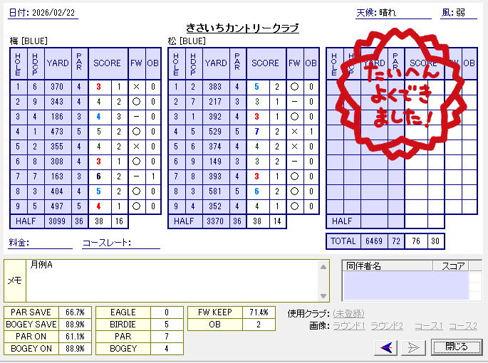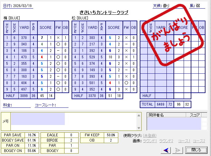 マレーシア旅行記はまた改めて。ごめんなさい。あまりにも成績が悪かったから(まあその理由=言い訳はあるんだけどね)更新に前向きになれないってのも、むちゃくちゃあるけれど。 っていうか今日、ホームコースでF冨後夫妻に久しぶりにお会いしたら、挨拶もそこそこに「早く更新してくださいー毎日見てるんですーああ今日も更新してないって残念がってるんですー」とむっちゃプレッシャー掛けられた(ホントは嬉しかったです)ので、確定申告は横に置いといて更新する。 まずは先週木曜日。マレーシア旅行という天国のあと、親父の葬式と後処理いう難題をクリアし、体調も気分も平常でない中で迎えた2週間ぶりのゴルフ。練習はぼちぼち行ってたけど、まだリハビリ中って感じで。 この日のテーマは「U3を使い倒す」。ちょっとハードなスペックの3Uが、コースでどれだけ使えるかを試すラウンド(言い訳)。 梅1番、3Uでティショット。いきなり天ぷら引っ掛けで左へOB。これ以上ない幸先悪し。 梅2番ティショット、ちょっとトップ気味だけどまずまず。 梅3番ティショット、186yだとさすがに大きすぎた。グリーン右奥へ。 梅4番パー5。U3を使わなかったらバーディが出た(笑) 梅5番ティショット、左が絶対ダメなので右へしか行かないU3はいい感じだった。 梅6番ティショット。ハーフトップで逆にいい感じ。 梅8番、トップしてベスポジへ。 梅9番は残り距離を考えてU5を使って◯。 というわけで梅は2番、5番、6番そして8番のティショットで使えばいい感じ。いままでU4使ってたけど、十分代わりに使える&4Wの代わりにも使えそう。 折り返して松。 2番、打ち下ろし入れて205yのパー3。このパー3ためにU3を買ったと言っても過言ではない(今までのU4では微妙に届かず、強振すると左が嫌だった)。ちょっと軽く打ちすぎて(ビビって、ともいう)手前花道。でも悪くない。 3番パー4、2打目U3はチョロ。しっかり距離を出そうと思うとチョロするね(いや、お前がヘタなだけやろ)。 4番パー5、ティショット左引っ掛けOB。当たりは良かった。そして前進4打からU3またチョロ。5打目U3、チョロふたたび。3連続チョロ(U3だけに)。フェアウェイからは重くて長い分、軌道がブレやすいんだろう(ヘタなだけ)。結局このパー5は二桁叩く。 5番~8番は使う機会がなく、最終9番2打目。スライスしてサブグリーン方向へ。 というわけで、フェアウェイからはあんまり欲張って振っちゃだめ。 ![]() バーディが(たまたま)2つ出たから100切ってるけど、そこでスカタンしてたら100叩いてたな。 そして迎えた今日、ホームコース月例。いつものN井さんといつものN川さん、そしてお初のF岡さん。最高気温22度、まさか2月に半袖でラウンドできる日が来るとは。 で、この日のテーマは「基本に戻る」。あんまりごちゃごちゃ考えず、小細工もせず、かといって消極的にもなりすぎず、結果を恐れず、自然体でラウンドしようと。まあしようと思ってできたら苦労しないんだけど。 でも、なぜかわからないけどできちゃった。自分に期待しなかったのが良かったのかな。 ![]() バーディ5つはまぐれだけど、アイアンがなぜかきちんと当たってくれた(10年に1度かもしれん)。 1番は2打目のウェッジショットが大ダフリ、しかしそれがダウンヒルに落ちて転がってピン横50cmに付く。いきなり大ラッキーバーディ。いや、ダフったけど振り切ったのが良かったんだろう(自分に甘い)。 2番パー4は5mのバーディパットを外してパー。 3番パー3はU5でピン上3mに。つまり3連続バーディチャンス。しかし1mオーバーして引っ掛けて3パット。これは「いい気になるなよ」という啓示と考えた(俺って偉い)。 4番パー5、2段グリーン下から8mのバーディパットを寄せてパー。 5番パー4、U3でちょっと引っ掛け気味(それあかんやつろ)、でも左ラフ。2打目PWでパーオン、4m入らずパー。 6番パー4、5Uちょっとフック気味で木に当たる。2打目9アイアン、芯食ってないけど方向良し、ぎりぎり届いて80cmに付くというラッキーふたたび。バーディ。 さて皆さんお気付きだろうか。普段18ホールで4つぐらいしかパーオンしない私が、ここまで6ホール連続パーオン。いかにアイアンが良かったかということだ。まあ、次のラウンドではまた4つに戻るけどね。 7番谷超えのパー3、5アイアンのティショットは50cmほどダフってOB。本領発揮か?トリプルボギー。 8番パー4、2打目8あいあんはこすってグリーン右奥へ、ワンクッションで乗せて2パットボギー。 ああ、今日はこれで終了かと思ったら、最終ホールパー5でティショット、U3、3打目50度のコントロールショットが完璧、4mの微妙に切れるパットもなぜか入ってバーディ。 というわけで前半は3バーディ!2ボギー1トリプルボギーで38。まあ、後半になると本領発揮するだろう、と思ったら。 1番こそアプローチが寄らずボギーだったものの、2番は久しぶりのチッパー(39度)で寄せワンパー。 3番パー4はティショットがいい当たりをし、2打目175y。期待せず持っ